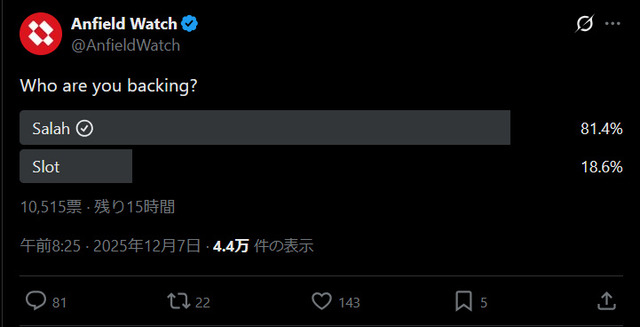 ◆悲報◆リバプールサポ緊急アンケート、スロットとサラーどっちを支持?サラー支持81% WorldFootballNews(2025-12-07)